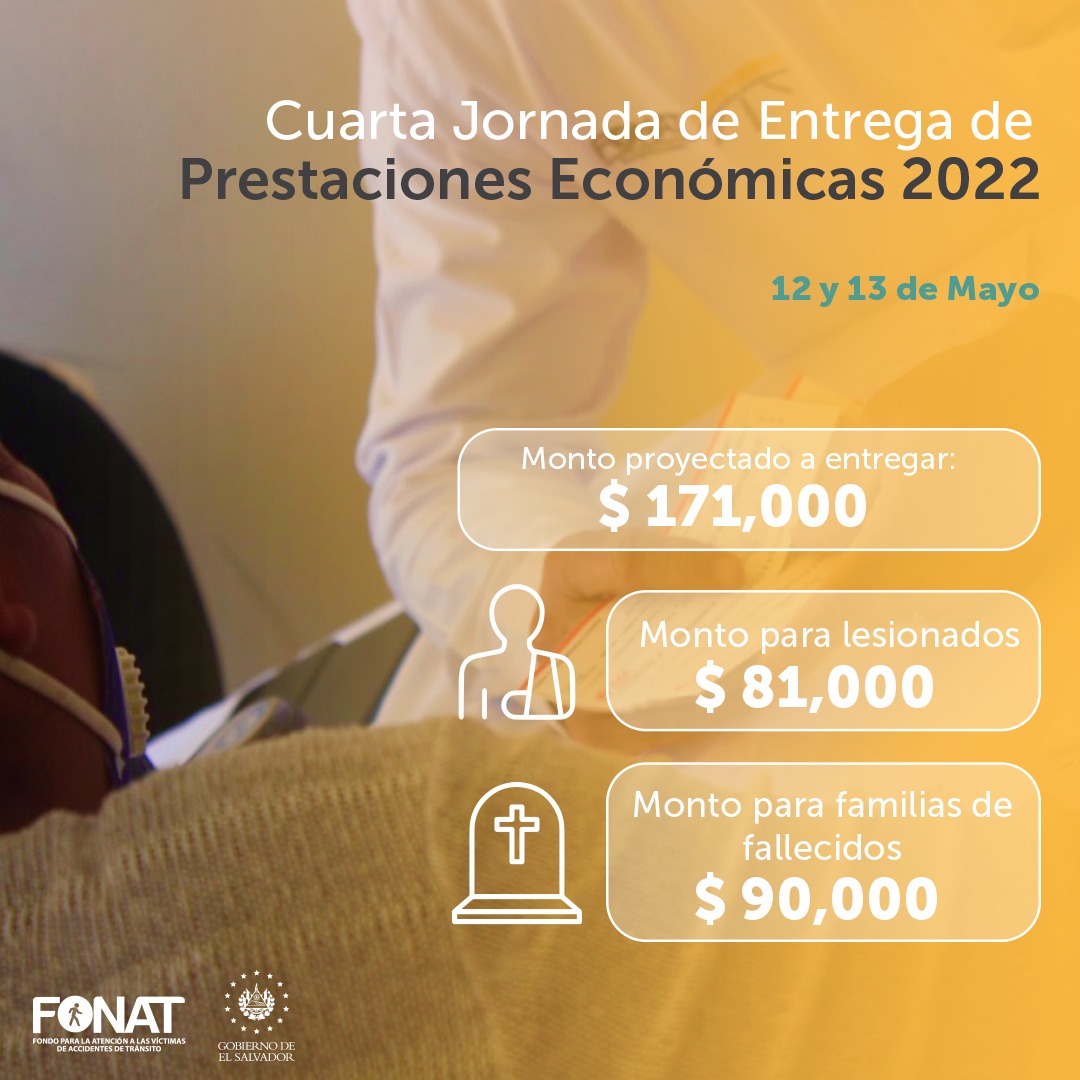 Más de 169 familias salvadoreñas afectadas por un siniestro vial a nivel nacional, recibirán el monto que se otorga con cada Prestación Prestación Económica, en la 4ta. Jornada de Entregas de Prestaciones Económicas del FONAT, que se realiza en forma simultánea en las tres sedes: San Salvador, Santa Ana y San Miguel, este jueves 12 y viernes 13 de mayo.